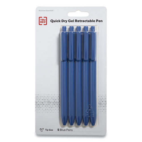 Product Details** Global Product Type Gel Pens Pen Style Retractable Pen Tip Type Conical Pen Point Size Type Medium Color Family Blue Erasable Ink No Refillable Yes Pen Sub-Brand & Product Family Quick Dry Pen Type Gel Pen Pen Point Size 0.7 mm Pen Ink Color(s) Blue Pen Barrel Color(s) Blue Low-Viscosity Ink No Special Ink Properties Advanced Ink Pen Grip Type Full-Length Rubber Visible Ink Supply No Pocket Clip Indicator Yes Product Biodegradability in Days 0 Pre-Consumer Recycled Content Percent 0% Post-Consumer Recycled Content Percent 0% Total Recycled Content Percent 0% Country Of Origin IN Carton Weight 10 lbs. Carton Pack Quantity 48 PK Pack Quantity 5 EA UPC 718103315807 UNSPSC 44121701 Shipping Weight & Item Dimensions Weight 0.183 lbs. Length 7.656 in Height 0.653 in Width 4.203 in