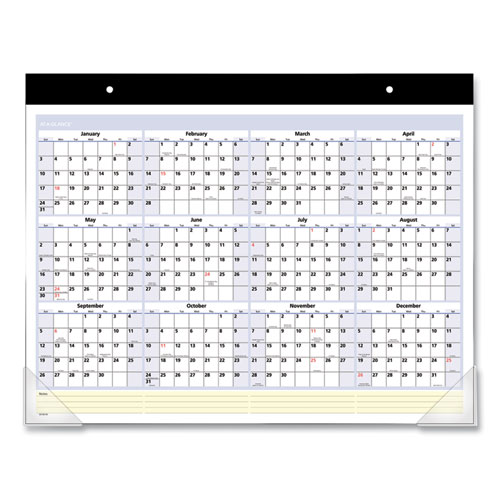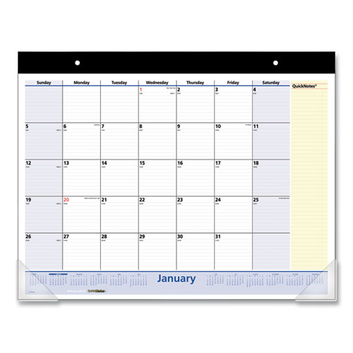 Protect your desk and stay organized. Monthly desk pad calendar features a one month per page format with generously sized daily blocks for important scheduling details as well as reference calendars for future planning. A yellow highlighted QuickNotes® section accommodates your important monthly notes and to-dos. Durable backboard provides a sturdy writing surface. Stapled and taped headband has two pre-punched eyelets, allowing you to repurpose your desk pad as a wall calendar, for added versatility. Printed on high-quality paper for superior ink-bleed resistance.