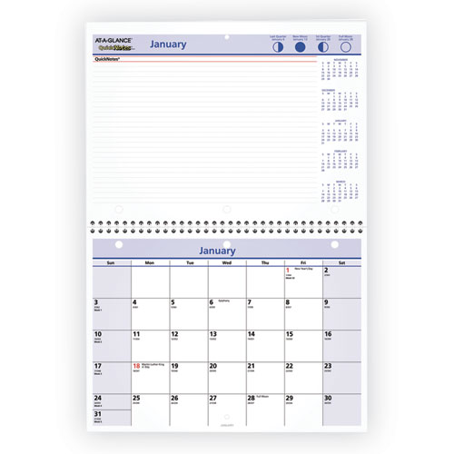 Yellow highlighted section for notes and to-do’s. One month per two-page spread with unruled blocks; shaded weekends; QuickNotes® section on top page. Current, two past and two future months reference; federal holidays highlighted. Wirebound and three-hole punched for binder use or hanging. Printed on high-quality paper with superior ink bleed resistance.