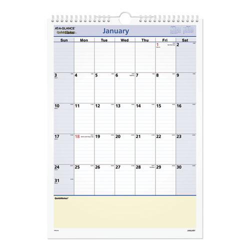Note what’s important to stay organized and focused all year long. Wall calendar’s highlighted and ruled QuickNotes® section accommodates your task and takeaway notations, making it easy to stay mindful of everything that’s important. One month per page format also features generously sized daily blocks with all important holidays listed as well as monthly reference calendar blocks-everything you need to stay on track. Metal twin-wire binding helps ensure everything stays together while allowing you to easily fold back each past month, so you can stay current and up to date. Sturdy chipboard backing doubles as an excellent writing pad, making it easy to jot down your notes regardless of where the calendar is hung. Printed entirely on high-quality paper for a smooth writing experience with superior ink-bleed resistance.