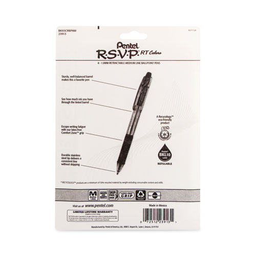 Product Details** Global Product Type Ballpoint Pens Pen Style Retractable Pen Tip Type Conical Pen Point Size Type Medium Color Family Multicolor Erasable Ink No Refillable Yes Pen Sub-Brand & Product Family R.S.V.P.® RT Pen Type Ballpoint Pen Pen Point Size 1 mm Pen Ink Color(s) Assorted Pen Ink Color(s) Assortment Black,Blue,Green,Orange,Pink,Red,Sky Blue,Violet Pen Barrel Color(s) Clear Airplane-Safe Ink Yes Low-Viscosity Ink No Pen Grip Type Textured Latex-Free Rubber Visible Ink Supply Yes Pocket Clip Indicator Yes Product Biodegradability Indicator N Product Biodegradability in Days 0 Product Compostability Indicator N Pre-Consumer Recycled Content Percent 61% Post-Consumer Recycled Content Percent 0% Total Recycled Content Percent 61% Country Of Origin MX Carton Weight 29 lbs. Carton Pack Quantity 72 PK Pack Quantity 8 EA UPC 072512239131 UNSPSC 44121704 Shipping Weight & Item Dimensions Weight 0.383 lbs. Length 7.38 in Height 0.56 in Width 5 in Warranty Manufacturer’s limited lifetime warranty.