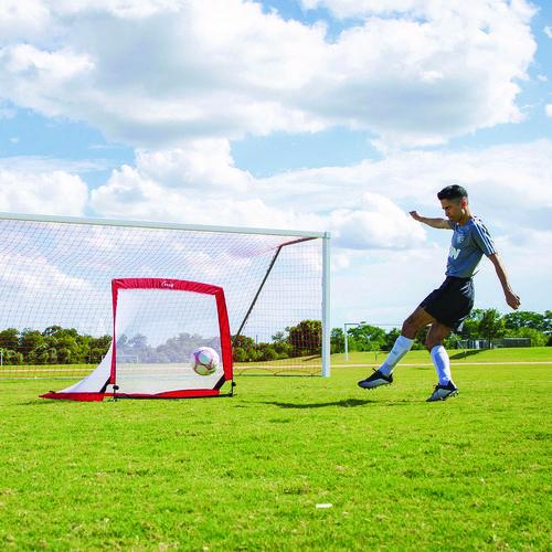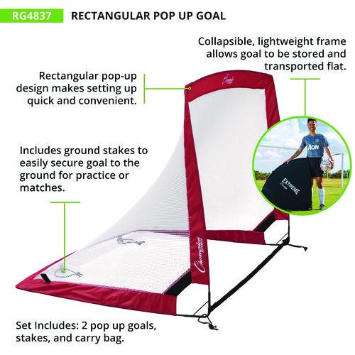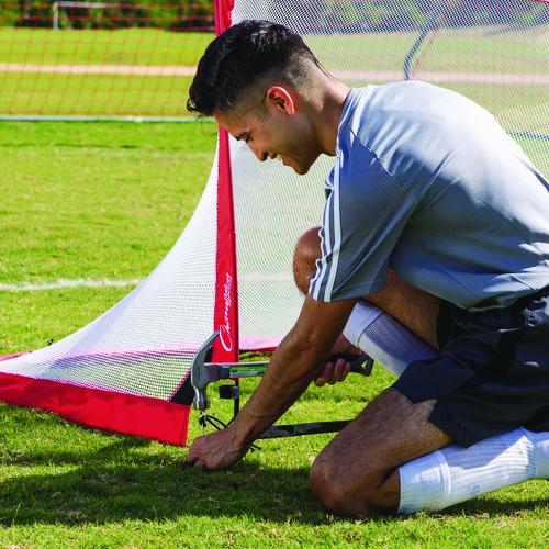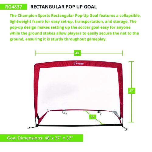 Ideal for practices, training, and gym classes, the Champion Sports Rectangular Pop-Up Goal features a collapsible, lightweight frame for easy set-up, transportation, and storage. The pop-up design makes setting up the soccer goal easy for anyone, while the ground stakes allow players to easily secure the net to the ground, ensuring it is sturdy throughout gameplay. Additionally, the lightweight frame and mesh netting is durable enough to withstand regular use, ensuring this soccer net can be used in various outdoor environments.