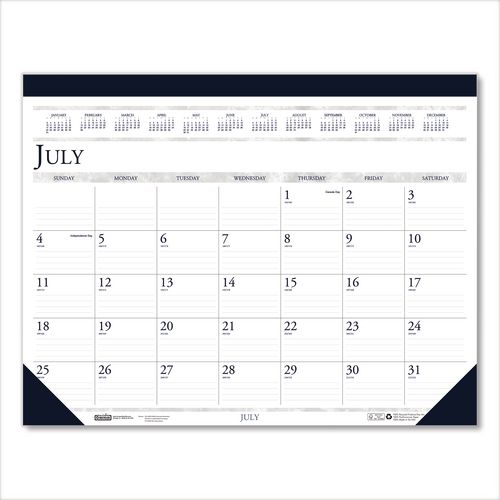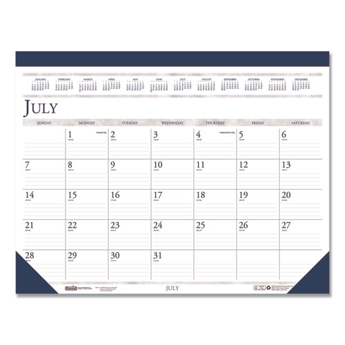 Product Details** Global Product Type Desk Pad Calendars Dated Yes Academic Year Yes Calendar Format Monthly Edition Year 2025 to 2026 Calendar Term 14-Month (July to Aug) Binding Type Stapled,Taped Color Family White Refillable No Calendar Spread Format One Month per Page Julian Dates Yes Size (Bound-Side First) 18.5 x 13 Binding Color(s) Blue Corner Color(s) Blue Calendar Reference Blocks Current Year Sheets per Calendar/Planner 14 Sheet Color(s) White/Blue Holder Style Two-Corner Desk-Pad with Backboard (Included) Holder Color Blue/Natural Holder Material Chipboard,Leatherette Reversible No Seasonal Availability Yes Product Biodegradability Indicator N Product Biodegradability in Days 0 Product Compostability Indicator N Green Information Printed with soy-based inks. Pre-Consumer Recycled Content Percent 0% Post-Consumer Recycled Content Percent 100% Total Recycled Content Percent 100% Disclaimer Statement This product was made using wood sourced from a certified managed forest. Country Of Origin US Carton Weight 32 lbs. Carton Pack Quantity 48 EA Pack Quantity 0 UPC 040983155724 UNSPSC 44112002 Shipping Weight & Item Dimensions Weight 0.666 lbs. Length 18.5 in Height 0.25 in Width 13 in