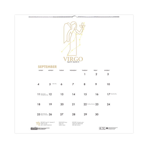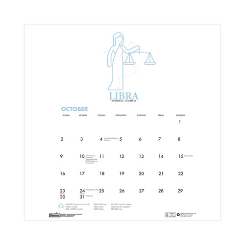 House of Doolittle 100% Recycled Zodiac calendar has a clean open space design printed on heavy-duty 100-lb paper. Each month the zodiac symbol along with the star pattern is displayed with the astrological time frame of the month. It also displays information about the astrological sign which includes elements, dates, ruling plant, house, mantra, body part, color and tarot card. Perfect size for smaller work areas plus the horizonal orientation fits for lower work area walls.