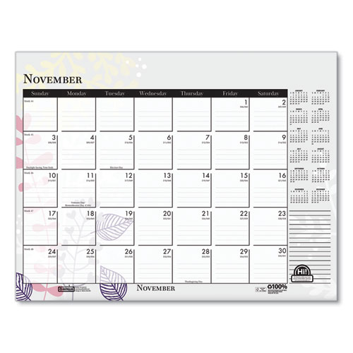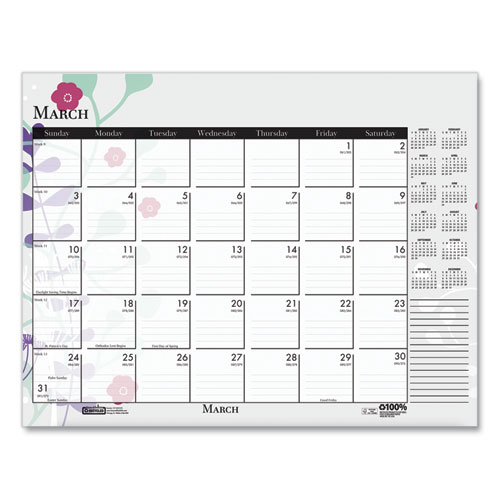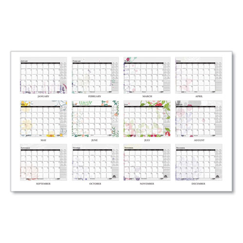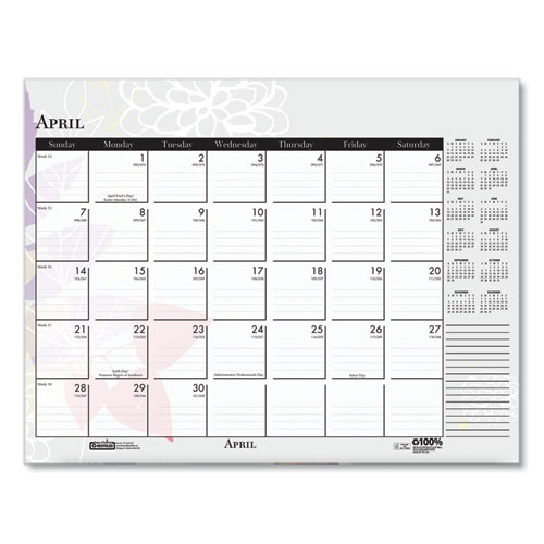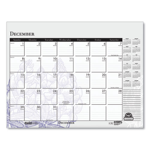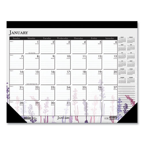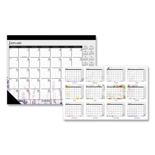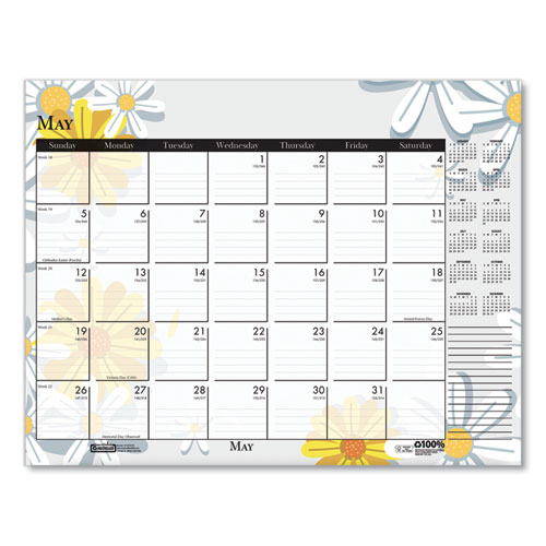 Product Details** Global Product Type Desk Pad Calendars Dated Yes Academic Year No Calendar Format Monthly Edition Year 2025 Calendar Term 12-Month (Jan to Dec) Binding Type Stapled,Taped Color Family White Refillable No Calendar Spread Format One Month per Page Julian Dates Yes Size (Bound-Side First) 22 x 17 Binding Color(s) Black Corner Color(s) Black Page Theme Wild Flowers Artwork Calendar Reference Blocks Current Year Separate Sections Notes/Memos Sheet Color(s) White/Multicolor Holder Style Two-Corner Desk-Pad with Backboard (Included) Holder Color Black/Natural Holder Material Chipboard,Leatherette Reversible No Seasonal Availability Yes Product Biodegradability Indicator N Product Biodegradability in Days 0 Product Compostability Indicator N Green Information Printed with soy-based inks. Pre-Consumer Recycled Content Percent 0% Post-Consumer Recycled Content Percent 100% Total Recycled Content Percent 100% Disclaimer Statement This product was made using wood sourced from a certified managed forest. Country Of Origin US Carton Weight 47 lbs. Carton Pack Quantity 48 EA Pack Quantity 0 UPC 040983197267 UNSPSC 44121621 Shipping Weight & Item Dimensions Weight 0.93 lbs. Length 22 in Height 2 in Width 17 in