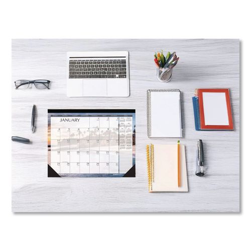 Product Details** Global Product Type Desk Pad Calendars Dated Yes Academic Year No Calendar Format Monthly Edition Year 2025 Calendar Term 12-Month (Jan to Dec) Binding Type Stapled,Taped Color Family White Refillable No Calendar Spread Format One Month per Page Julian Dates Yes Size (Bound-Side First) 18.5 x 13 Binding Color(s) Black Corner Color(s) Black Page Theme Seascapes Photography Calendar Reference Blocks Current Year Separate Sections Notes/Memos Sheet Color(s) White/Multicolor Holder Style Two-Corner Desk-Pad with Backboard (Included) Holder Color Black/Natural Holder Material Chipboard,Leatherette Reversible No Seasonal Availability Yes Product Biodegradability Indicator N Product Biodegradability in Days 0 Product Compostability Indicator N Green Information Printed with soy-based inks. Pre-Consumer Recycled Content Percent 0% Post-Consumer Recycled Content Percent 100% Total Recycled Content Percent 100% Disclaimer Statement This product was made using wood sourced from a certified managed forest. Country Of Origin US Carton Weight 48 lbs. Carton Pack Quantity 48 EA Pack Quantity 0 UPC 040983138673 UNSPSC 44112002 Shipping Weight & Item Dimensions Weight 0.614 lbs. Length 18.5 in Height 0.2 in Width 13 in