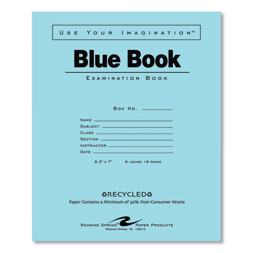 Product Details** Global Product Type Exam Books Pocket Sized No Book-Binding Type Stapled Color Family Blue Number of Subjects/Sections 1 Sheet Size (Bound-Side First) 8.5 x 7 Sheet Rule/Format Type Wide/Legal Rule Book-Binding Edge Side Cover Color Blue Book-Spine Length 8.5″ Book Width 7″ Front-Cover Material 50 lb Offset Weight Paper Sheets per Book/Journal 8 Sheet Color White Sheet Ruling Size 11/32″ Sheet-Ruling Color Blue Sheet Basis Weight (lb) 15 lb Bond Dated No Product Biodegradability Indicator N Product Biodegradability in Days 0 Product Compostability Indicator N Green Information Cover contains 30% recycled content,paper contains 30% post-consumer waste. Pre-Consumer Recycled Content Percent 0% Post-Consumer Recycled Content Percent 0% Total Recycled Content Percent 0% Country Of Origin US Carton Weight 31 lbs. Carton Pack Quantity 600 EA Pack Quantity 0 UPC 000000000000 UNSPSC 60101722 Shipping Weight & Item Dimensions Weight 31.04 lbs. Length 17.25 in Height 5.5 in Width 14.25 in