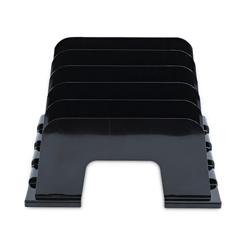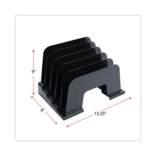 Product Details** Global Product Type Vertical & Incline Desktop Document Racks & Sorters Number of Compartments 5 For File Size Letter Load Orientation Top/Side Color Family Black Color(s) Black Material(s) Plastic Width 13.25″ Depth 9″ Height 9″ Product Biodegradability Indicator N Product Biodegradability in Days 0 Product Compostability Indicator N Green Information Made from 30% post recycled plastic Compliance Standards EPA/CPG Compliant Pre-Consumer Recycled Content Percent 0% Post-Consumer Recycled Content Percent 30% Total Recycled Content Percent 30% Special Features Large Sorter—Holds file folders, notepads and more. Country Of Origin US Carton Weight 4 lbs. Carton Pack Quantity 2 EA Pack Quantity 0 UPC 087547081051 UNSPSC 44111503 Shipping Weight & Item Dimensions Weight 1.51 lbs. Length 13.25 in Height 9 in Width 9.12 in Warranty Manufacturer’s limited one-year warranty.