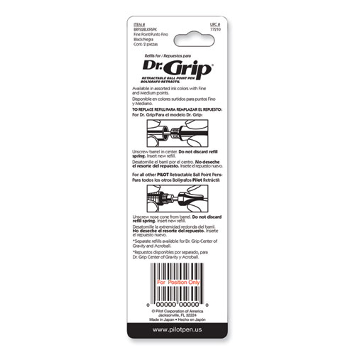 Product Details** Global Product Type Ballpoint Pen Refills Refill Format Standard Ballpoint Color Family Black Tip/Nib Type Conical Tip/Nib Size Type Fine Erasable Ink No Refill For Series Pilot® B2P Retractable Ballpoint Pens, Dr Grip® Retractable Ballpoint Pens, Dr Grip® Center of Gravity Retractable Ballpoint Pens, Dr Grip® Neon Retractable Ballpoint Pens, Easytouch Retractable Ballpoint Pens, Rex Grip BeGreen® Retractable Ballpoint Pens, The Better Retractable Ballpoint Pens Refill Ink Color Black Permanent/Washable Ink Washable Airplane-Safe Ink Yes Low-Viscosity Ink No Product Biodegradability Indicator N Product Biodegradability in Days 0 Product Compostability Indicator N Pre-Consumer Recycled Content Percent 0% Post-Consumer Recycled Content Percent 0% Total Recycled Content Percent 0% Country Of Origin JP Carton Weight 3 lbs. Carton Pack Quantity 144 PK Pack Quantity 2 EA UPC 072838772107 UNSPSC 44121904 Shipping Weight & Item Dimensions Weight 0.011 lbs. Length 6 in Height 0.2 in Width 1.8 in Warranty Manufacturer’s unconditional warranty.