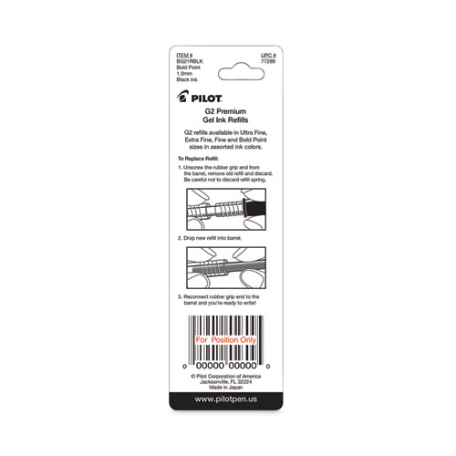 Product Details** Global Product Type Gel Pen Refills Refill Format Standard Gel Color Family Black Tip/Nib Type Conical Tip/Nib Size Type Bold Erasable Ink No Refill For Series Pilot® G2 Gel Ink Pens Refill Ink Color Black Airplane-Safe Ink Yes Low-Viscosity Ink Yes Product Biodegradability Indicator N Product Biodegradability in Days 0 Product Compostability Indicator N Pre-Consumer Recycled Content Percent 0% Post-Consumer Recycled Content Percent 0% Total Recycled Content Percent 0% Country Of Origin JP Carton Weight 3 lbs. Carton Pack Quantity 72 PK Pack Quantity 2 EA UPC 072838772893 UNSPSC 44121904 Shipping Weight & Item Dimensions Weight 0.14 lbs. Length 1.88 in Height 6 in Width 0.33 in Warranty Manufacturer’s unconditional warranty.