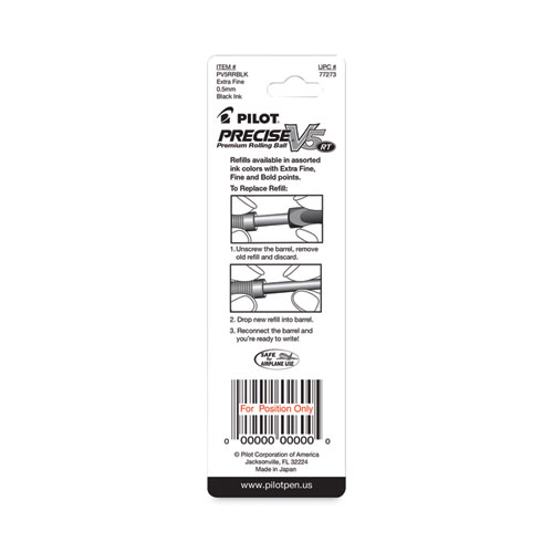 Product Details** Global Product Type Rollerball Pen Refills Refill Format Standard Ceramic Rollerball Color Family Black Tip/Nib Type Conical Tip/Nib Size Type Extra-Fine Erasable Ink No Refill For Series Pilot® Precise V5 RT Roller Ball Pens Refill Ink Color Black Permanent/Washable Ink Washable Airplane-Safe Ink No Product Biodegradability Indicator N Product Biodegradability in Days 0 Product Compostability Indicator N Pre-Consumer Recycled Content Percent 0% Post-Consumer Recycled Content Percent 0% Total Recycled Content Percent 0% Country Of Origin JP Carton Weight 2 lbs. Carton Pack Quantity 72 PK Pack Quantity 2 EA UPC 072838772732 UNSPSC 44121908 Shipping Weight & Item Dimensions Weight 0.018 lbs. Length 6 in Height 0.33 in Width 1.88 in Warranty Manufacturer’s unconditional warranty.