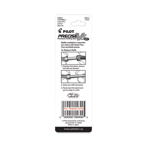 Product Details** Global Product Type Rollerball Pen Refills Refill Format Standard Ceramic Rollerball Color Family Blue Tip/Nib Type Conical Tip/Nib Size Type Extra-Fine Erasable Ink No Refill For Series Pilot® Precise V5 RT Roller Ball Pens Refill Ink Color Blue Permanent/Washable Ink Washable Airplane-Safe Ink No Product Biodegradability Indicator N Product Biodegradability in Days 0 Product Compostability Indicator N Pre-Consumer Recycled Content Percent 0% Post-Consumer Recycled Content Percent 0% Total Recycled Content Percent 0% Country Of Origin JP Carton Weight 2 lbs. Carton Pack Quantity 72 PK Pack Quantity 2 EA UPC 072838772749 UNSPSC 44121908 Shipping Weight & Item Dimensions Weight 0.018 lbs. Length 6 in Height 0.33 in Width 1.88 in Warranty Manufacturer’s unconditional warranty.