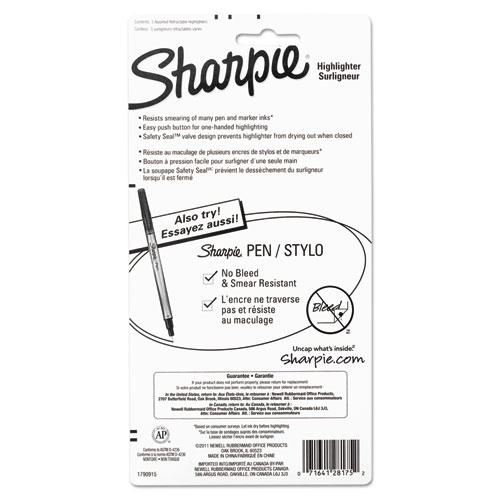 Product Details** Global Product Type Retractable Highlighters Highlighter Style Pen Color Family Multicolor Highlighter Tip Type Chisel Highlighters Erasable Ink No Retractable Yes Pocket Clip Indicator Yes Highlighter Ink Color Assorted Highlighter Ink Color Assortment Blue,Fluorescent Green,Fluorescent Pink,Fluorescent Yellow,Orange Highlighter Barrel Color Assorted Highlighter Barrel Color Assortment Blue/Black,Green/Black,Pink/Black,Yellow/Black,Orange/Black Grip Type Smooth Product Biodegradability Indicator N Product Biodegradability in Days 0 Product Compostability Indicator N Compliance Standards ACMI AP Non-Toxic Certified Pre-Consumer Recycled Content Percent 0% Post-Consumer Recycled Content Percent 0% Total Recycled Content Percent 0% Country Of Origin CN Carton Weight 9 lbs. Carton Pack Quantity 48 ST Pack Quantity 5 EA UPC 071641281752 UNSPSC 44121716 Shipping Weight & Item Dimensions Weight 0.165 lbs. Length 8.2 in Height 0.6 in Width 4.2 in