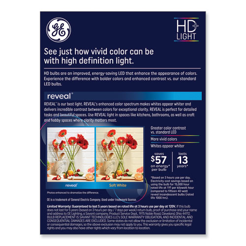 Reveal HD+ LED bulbs provide dimmable pure, clean light. The advanced technology enhances colors plus whitens white for exceptional clarity. Replace ordinary bulbs with Reveal light to see vivid colors and vibrant whites in high definition. Unlike CFL bulbs, Reveal LED HD+ bulbs feature exceptional color, instant full brightness and are free of Mercury. Use them where clarity matters, especially kitchens, bathrooms and craft and hobby spaces.