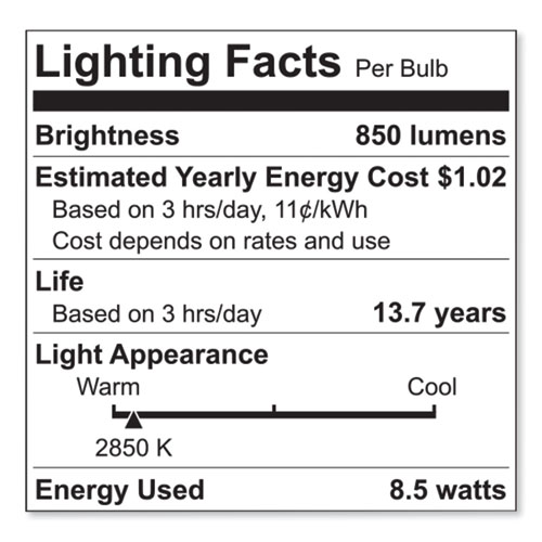 Product Details** Global Product Type LED Light Bulbs Bulb/Tube Technology Dimmable LED Bulb/Tube Type A19 Power 8.5 W Equivalent to Incandescent 75 W Appearance Reveal® Brightness 850 lm Bulb/Tube Bulb Bulb Shape Globe Voltage 120 V Energy Saver Yes Application General Purpose Industry Standard Number LED9DA19M/RVLGW-4 Model Name/Number 93127795 Color Temperature 2850 K Rated Life 15,000 h Product Biodegradability Indicator N Product Biodegradability in Days 0 Product Compostability Indicator N Compliance Standards cULus,FTC Pre-Consumer Recycled Content Percent 0% Post-Consumer Recycled Content Percent 0% Total Recycled Content Percent 0% Country Of Origin CN Carton Weight 4 lbs. Carton Pack Quantity 6 PK Pack Quantity 4 EA UPC 043168521116 UNSPSC 39101600 Shipping Weight & Item Dimensions Weight 0.399 lbs. Length 2.52 in Height 6.89 in Width 5.12 in Warranty Manufacturer’s limited five-year warranty.