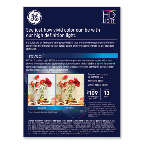 Reveal HD+ LED bulbs provide dimmable pure, clean light. The advanced technology enhances colors plus whitens white for exceptional clarity. Replace ordinary bulbs with Reveal light to see vivid colors and vibrant whites in high definition. Unlike CFL bulbs, Reveal LED HD+ bulbs feature exceptional color, instant full brightness and are free of Mercury. Use them where clarity matters, especially kitchens, bathrooms and craft and hobby spaces.