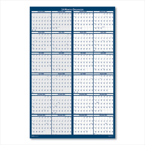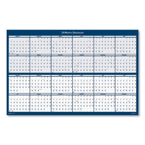 View two full years at one glance on this laminated write-on/wipe-off wall planner that has a vertical format calendar on one side and a horizontal format calendar on the other side to fit your office space. Easily erases with a damp cloth for changing plans. Black water-soluble marker and hang tabs included.