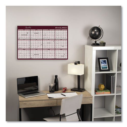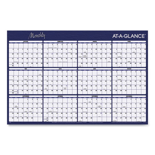 Plan and organize your year with this erasable and reversible extra-large wall calendar. It displays 12 months from January to December on each side and is great for personal or group use. Calendar is reversible for twice the planning power. One side is lined in red and the other side is in blue. Provides a convenient visual reference for long term planning. Erasable write-on/wipe-off surface lets you quickly revise plans. Simply wipe the calendar clean and start over. Two wet-erase markers are included for your convenience. Bold, large print allows for easier viewing and reading. Unruled daily blocks provide plenty of writing space for notes and reminders. Extra-large 48″ x 32″ page size calendar in horizontal format offers plenty of room to keep track of a busy schedule.
