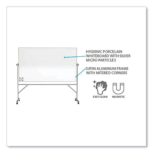 Reversible Magnetic Hygienic Porcelain Whiteboard with aluminum frame and stand is the perfect solution for high-touch, high-use environments where mobility is desired. The traditional functionality of a mobile, magnetic, reversible whiteboard combines with a clean, next-generation writing surface to take whiteboard performance to the next level. The porcelain-on-steel surface features embedded micro-silver particles that are slowly released over the lifetime of the product to protect it from bacterial and viral contaminants-contaminants are eliminated within 24 hours of contact. Scratch- and dent-resistant surface also ensures that your dry erase board never absorbs ink, eliminating the possibility of staining and ghosting. As the surface is magnetic, you can incorporate magnetic clips, characters and a variety of board accessories to accomplish any number of display and instructional goals. Strong aluminum frame and stand deliver reliable durability, and a robust, locking surface-reversing mechanism makes it easy to flip and set the chosen board surface in place. Twin-wheel swivel casters keep you mobile; and by making use of the two locking casters, you can keep the board stable where you intend to use it. Ships to you in Ghent’s worry-free packaging, which is designed specifically for keeping mobile dry erase boards safe during shipping.