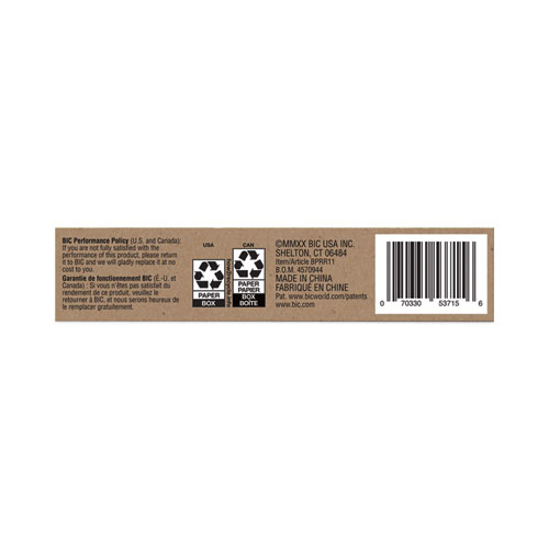 Product Details** Global Product Type Ballpoint Pens Pen Style Retractable Pen Tip Type Conical Pen Point Size Type Medium Color Family Blue Erasable Ink No Refillable Yes Pen Sub-Brand & Product Family ReVolution Ocean Bound Pen Type Ballpoint Pen Pen Point Size 1 mm Pen Ink Color(s) Blue Pen Barrel Color(s) Translucent Blue Archival-Quality Ink No Airplane-Safe Ink Yes Low-Viscosity Ink No Pen Grip Type Smooth Visible Ink Supply Yes Pocket Clip Indicator Yes Product Biodegradability Indicator N Product Biodegradability in Days 0 Product Compostability Indicator N Compliance Standards ACMI AP Non-Toxic Certified,Green Seal Certified Pre-Consumer Recycled Content Percent 0% Post-Consumer Recycled Content Percent 73% Total Recycled Content Percent 73% Disclaimer Statement Ocean Bound plastic is plastic material collected within 50 km of a shore or a waterway that leads to the ocean. Country Of Origin CN Carton Weight 9 lbs. Carton Pack Quantity 18 DZ Pack Quantity 0 UPC 070330537156 UNSPSC 44121704 Shipping Weight & Item Dimensions Weight 0.43 lbs. Length 6 in Height 1.31 in Width 2.75 in