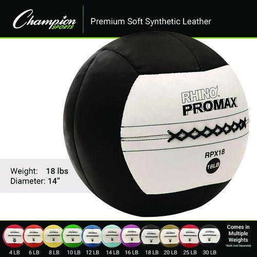 Get an intense workout with the Champion Sports Rhino® Promax Medicine Ball. Use it for throwing, catching and more while exercising to improve strength and cardio. This softshell medicine ball features a synthetic leather cover for added comfort and grip. The Rhino® Skin shell offers exceptional durability to withstand extreme workout routines without ever losing its shape or weight balance.