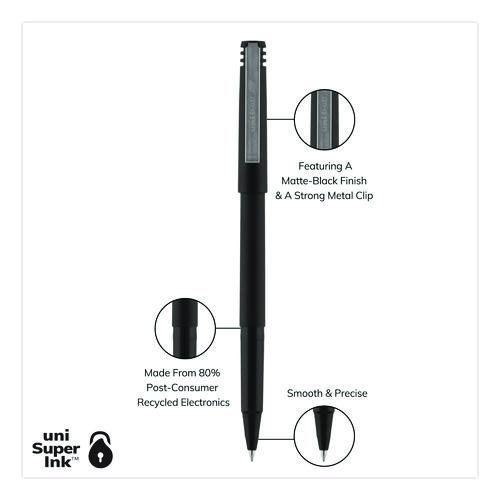 Product Details** Global Product Type Rollerball Pens Pen Style Stick Pen Tip Type Conical Pen Point Size Type Extra-Fine Color Family Black Erasable Ink No Refillable No Pen Type Rollerball Pen Pen Point Size 0.5 mm Pen Ink Color(s) Black Pen Barrel Color(s) Black Pen Cap Color(s) Black Airplane-Safe Ink No Special Ink Properties Chemical-Dye Water-Based Ink Pen Grip Type Smooth Visible Ink Supply No Pocket Clip Indicator Yes Product Biodegradability Indicator N Product Biodegradability in Days 0 Product Compostability Indicator N Green Information Post-consumer recycled content sourced from recycled consumer electronics. Pre-Consumer Recycled Content Percent 0% Post-Consumer Recycled Content Percent 80% Total Recycled Content Percent 80% Country Of Origin JP Carton Weight 4 lbs. Carton Pack Quantity 12 DZ Pack Quantity 0 UPC 030246601518 UNSPSC 44121701 Shipping Weight & Item Dimensions Weight 0.256 lbs. Length 5.7 in Height 1 in Width 2.9 in