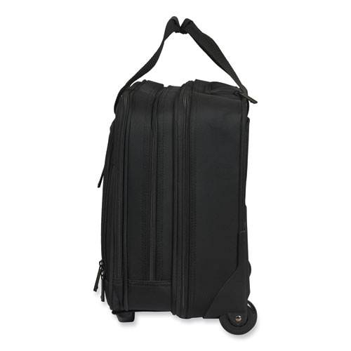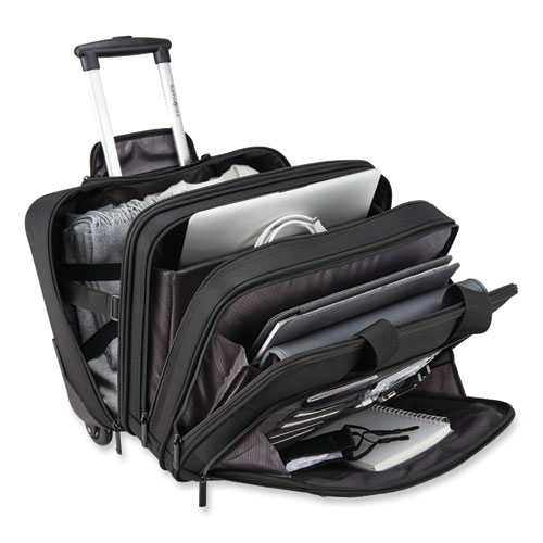 Includes a padded laptop compartment and front organizer pocket for business essentials. Smooth-rolling, in-line skate wheels and adjustable upright handle to adjust to your height. Zippered compartment for extra files or a change of clothes. Holds up to 15.6 laptops in separate padded compartment with zipper. Includes compartment for files and a quick access pocket on front panel. SmartPocket™ feature allows you to slide case over handle of upright luggage for easy transport.