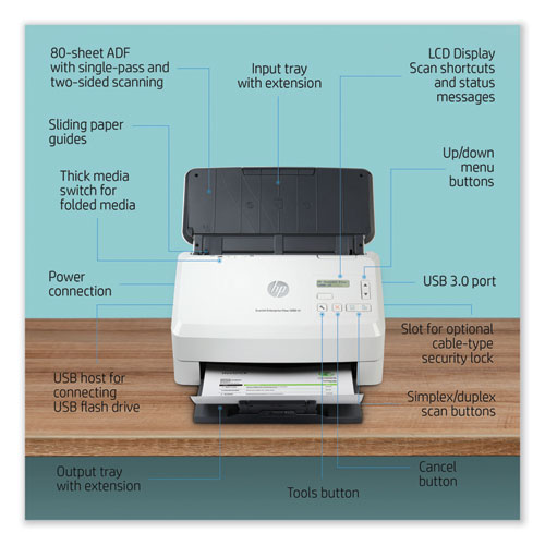 Easily and quickly transfer scans into editable text, encrypted PDF files, and more, using built-in OCR. Handle large volumes at blazing speeds. Capture every page easily even stacks of mixed media with HP EveryPage and an ultrasonic sensor. Centralize control of your scanning environment with HP Web Jetadmin and help build business efficiency. Do more with data, using multiple scan-to options; folders, FTP sites, e-mail, USB drives, SharePoint, and more. Define scan profiles, scan to the Cloud and other destinations, and automatically enhance images. Embedded OCR creates searchable files that can be scanned to multiple destinations with advanced auto-imaging.