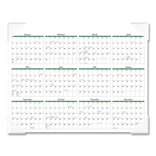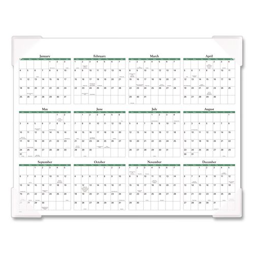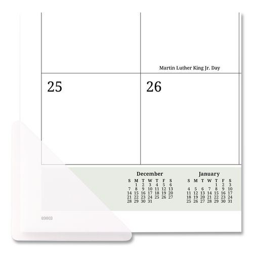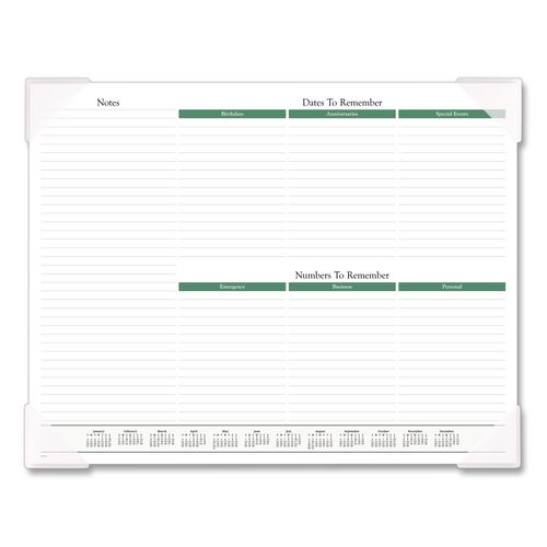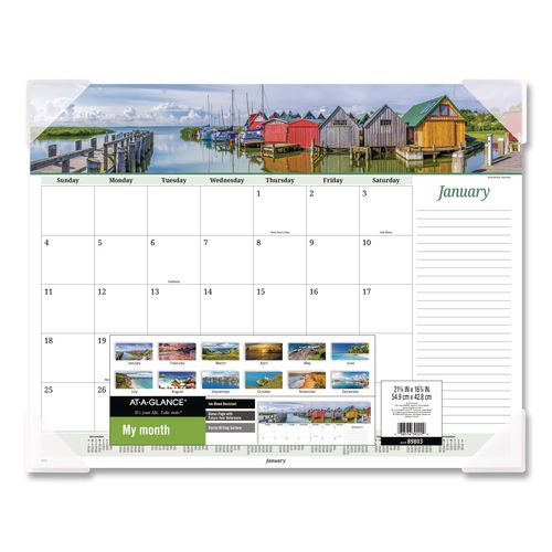 Seascape desk pad transports you to the beach while you work. Durable backboard provides a sturdy writing surface. Features full-color, wide-view photos. One month per page with unruled blocks and lined notes space. Full-year calendar reference; federal holidays highlighted. Includes current- and future-year reference calendars and “Dates to Remember” bonus pages. Four clear poly corners keep pages flat. Printed on high-quality paper with superior ink bleed resistance.