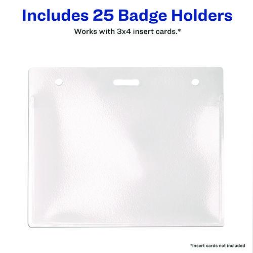Secure design keeps badges from falling out. Heavyweight flexible plastic is ideal for permanent or temporary identification. Protect security access control cards or create name badges. Multi-use styles are pre-punched to accommodate lanyards and reel clips. Use with Avery® Name Badge Inserts (5390 and 5392). Easy to Customize with free templates and designs using Avery Design & Print online.
