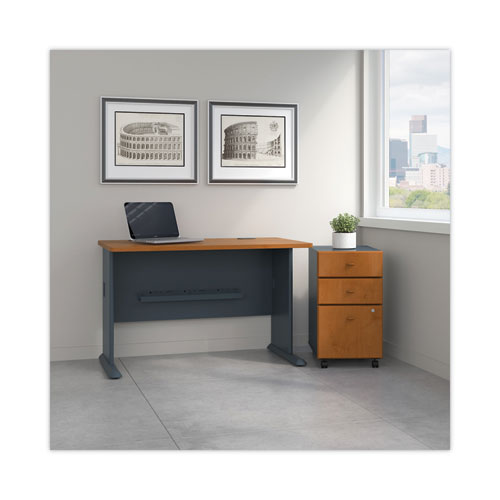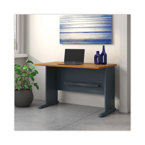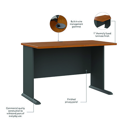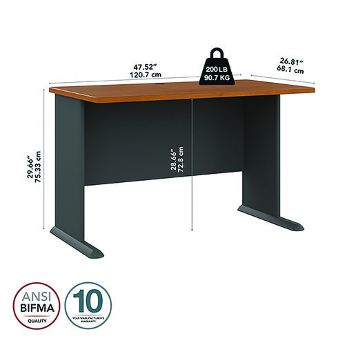 Product Details** Global Product Type Desk Shells Worksurface Shape Rectangular Color Family Cherry Pedestal Count 0 Keyboard/Mouse Platform Indicator No CPU Holder/Platform Indicator No Number of Drawers 0 Series Name Bush® Series A Collection Worksurface/Base Color Natural Cherry/Slate Gray Worksurface Material Thermally Fused Laminate Over Engineered Wood Edge Detail Profile Edge Band Base Material Engineered Wood,Thermally-Fused Laminate (TFL) Overall Width (Max) 47.63″ Overall Depth (Max) 26.88″ Overall Height (Max) 29.88″ Number of Shelves 0 For Use With Bush® Series A Collection Product Biodegradability in Days 0 Green Information EPA Primary Metal Free. Compliance Standards Level 1 Certified,Meets or Exceeds ANSI/BIFMA Standards Pre-Consumer Recycled Content Percent 45% Post-Consumer Recycled Content Percent 5% Total Recycled Content Percent 50% Country Of Origin US Carton Weight 76 lbs. Carton Pack Quantity 1 EA Pack Quantity 0 UPC 042976574482 UNSPSC 56101703 Shipping Weight & Item Dimensions Weight 76 lbs. Length 51.88 in Height 3.63 in Width 28.13 in Warranty Manufacturer’s ten-year warranty.