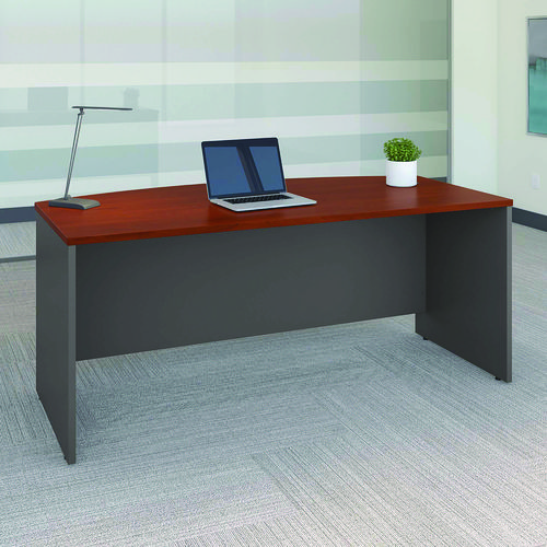 Product Details** Global Product Type Desk Shells Worksurface Shape Rectangular,Curved Front Color Family Cherry Pedestal Count 0 Keyboard/Mouse Platform Indicator No CPU Holder/Platform Indicator No Number of Drawers 0 Series Name Bush® Series C Collection Worksurface/Base Color Hansen Cherry/Graphite Gray Worksurface Material Thermally Fused Laminate Over Engineered Wood Worksurface Thickness 1″ Edge Detail Profile Edge Band Base Material Engineered Wood,Thermally-Fused Laminate (TFL) Overall Width (Max) 71.13″ Overall Depth (Max) 36.13″ Overall Height (Max) 29.88″ Number of Shelves 0 For Use With Bush® Series C Return Bridge and Credenza Product Biodegradability in Days 0 Green Information EPA Primary Metal Free. Compliance Standards Level 1 Certified,Meets or Exceeds ANSI/BIFMA Standards Pre-Consumer Recycled Content Percent 45% Post-Consumer Recycled Content Percent 5% Total Recycled Content Percent 50% Country Of Origin US Carton Weight 142 lbs. Carton Pack Quantity 1 EA Pack Quantity 0 UPC 042976244460 UNSPSC 56101703 Shipping Weight & Item Dimensions Weight 142 lbs. Length 39.3 in Height 3.9 in Width 78.4 in Warranty Manufacturer’s ten-year warranty.