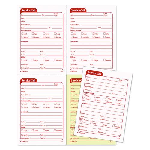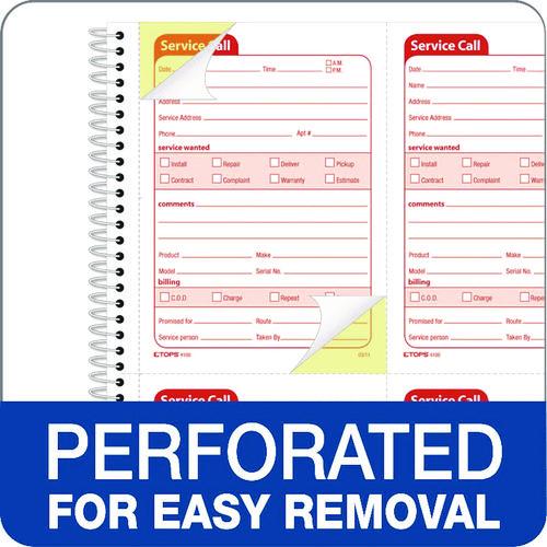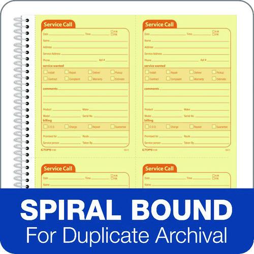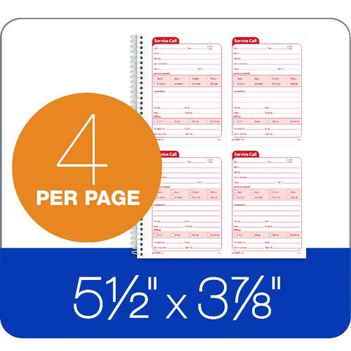 Record service call information on a 2-part form in a convenient spiral bound booklet. Carbonless with white original and canary duplicate. Four message slips per page. Shaded area with check-off boxes for work completed. Stop card prevents write-through. Copy remains in book as permanent record. Two-part carbonless duplicates.