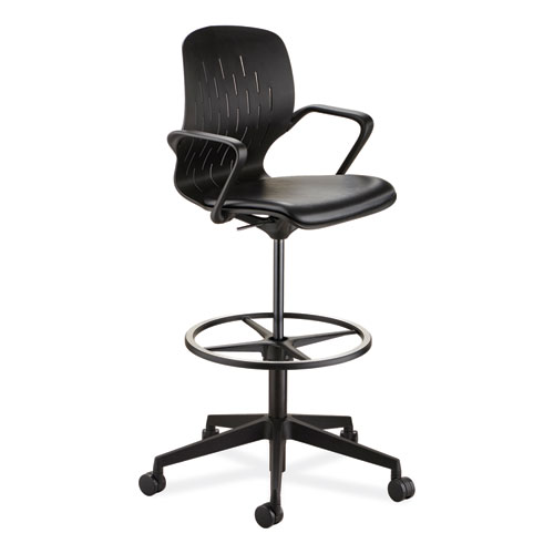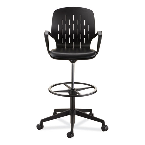 The easy-to-use Shell™ Extended-Height Chair provides intuitive adjustments and a sleek design that suits any workspace. Featuring a contoured back for lumbar support and a frame that naturally flexes to fit the individual user, this drafting chair is great for long work days. For additional comfort, the seat and arms are available with upholstered padding. The seat’s back includes stylish holes that provide comfortable breathability during use. Upholstery is vinyl, making it easy-to-clean. The seat height of this chair is easily adjustable from 22″ to 32″ to suit a wide range of user heights. This height pairs perfectly with standing or adjustable-height desks to help encourage a more active, yet comfortable, workday. The flat footring around the base provides an ergonomic support while sitting, and is adjustable to suit the needs of the user. A sturdy, five-star base with casters and 360-degree swivel capabilities ensures the user can move and reach anything they need throughout the day. Great for use in personal workspaces, computer labs, home offices, design studios, architecture firms, warehouses, conference rooms or anywhere else an extended-height chair is needed.