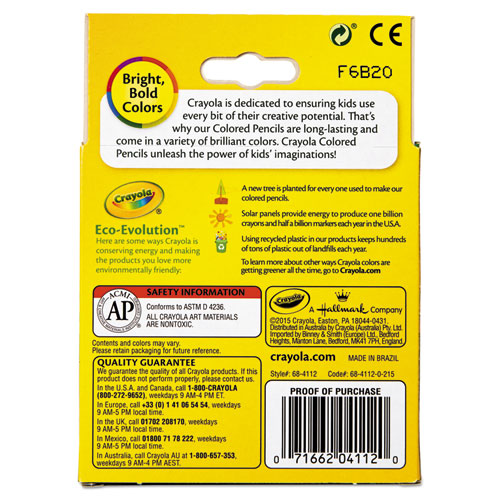Product Details** Global Product Type Art Pencils Retractable No Eraser (Yes/No) No Color Family Multicolor HB Graphite Scale 2B Refillable No Graphite Color(s) Assorted Graphite Color Assortment Black,Blue,Brown,Green,Light Brown,Orange,Red Orange,Red,Sky Blue,Violet,Yellow,Yellow Green Pencil Barrel Color(s) Assorted Pencil Barrel Color Assortment Black,Blue,Brown,Green,Light Brown,Orange,Red Orange,Red,Sky Blue,Violet,Yellow,Yellow Green Pencil Barrel Material Wood Pencil Grip Type Smooth Round Graphite Diameter 3.3 mm Pocket Clip Indicator No Art/Drafting Pencil Grade Art/Design Student Pre-Sharpened Woodcase (Yes/No) Yes Age Recommendation Ages 6 and Up Product Biodegradability Indicator N Product Biodegradability in Days 0 Product Compostability Indicator N Green Information Contains 100% reforested wood. Compliance Standards ACMI AP Non-Toxic Certified,Conforms to ASTM D 4236 Pre-Consumer Recycled Content Percent 0% Post-Consumer Recycled Content Percent 0% Total Recycled Content Percent 0% Special Features Short Length Pencil—For little hands. Country Of Origin BR Carton Weight 5 lbs. Carton Pack Quantity 48 ST Pack Quantity 12 EA UPC 071662041120 UNSPSC 44121707 Shipping Weight & Item Dimensions Weight 0.088 lbs. Length 4.8 in Height 0.3 in Width 3.5 in