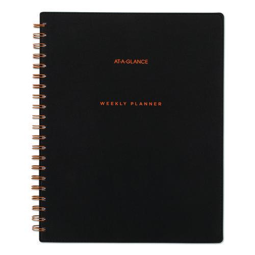 The AT-A-GLANCE Signature Lite Weekly Monthly Planner gives you everything you need to stay on track this year in one sleek, modern package. Give your planning some professional style with the modern and simplified cover with foil accents and a die-cut year detail. Plan your schedule without fear of distracting ink bleeding. Our high-quality paper has ink bleed resistance to keep your planning pages neat?. Weekly planning pages show day-to-day events and notes in an instant. Tabbed monthly overviews help you keep an eye on the big picture and get a jump on future plans. Get more done this year with help from special pages including holiday list, a three-year reference calendar and others.? The flexible yet durable cover keeps it shape, while the twin wire binding helps prevent snags when you throw it in your bag.?