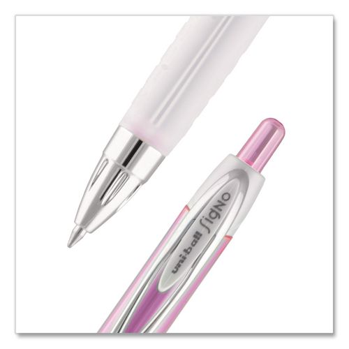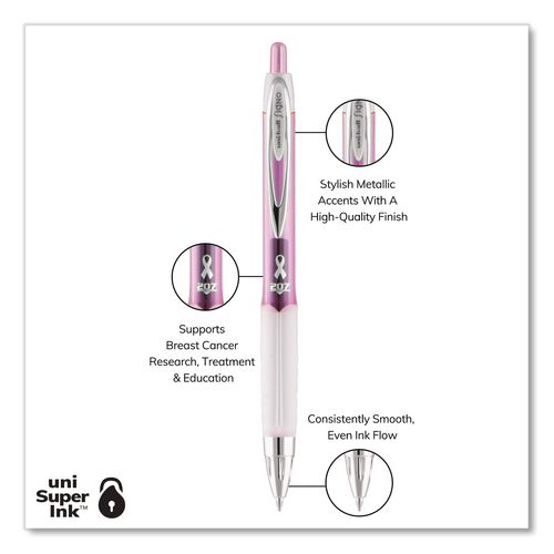 Product Details** Global Product Type Gel Pens Pen Style Retractable Pen Tip Type Conical Pen Point Size Type Medium Color Family Black Erasable Ink No Refillable Yes Pen Sub-Brand & Product Family Signo 207 City of Hope™ Edition Pen Type Gel Pen Pen Point Size 0.7 mm Pen Ink Color(s) Black Pen Barrel Color(s) Translucent Pink/White Low-Viscosity Ink No Special Ink Properties uni Super Ink™ Pen Grip Type Textured Visible Ink Supply Yes Pocket Clip Indicator Yes Manufacturer Pen Refill # 65873PP Product Biodegradability Indicator N Product Biodegradability in Days 0 Product Compostability Indicator N Pre-Consumer Recycled Content Percent 0% Post-Consumer Recycled Content Percent 0% Total Recycled Content Percent 0% Pink Comments $1.20 from the sale of each dozen pens will be donated to the City of Hope for breast cancer research, treatment and education. Country Of Origin JP Carton Weight 4 lbs. Carton Pack Quantity 12 DZ Pack Quantity 0 UPC 030246000977 UNSPSC 60121524 Shipping Weight & Item Dimensions Weight 0.302 lbs. Length 5.991 in Height 1.184 in Width 3.135 in