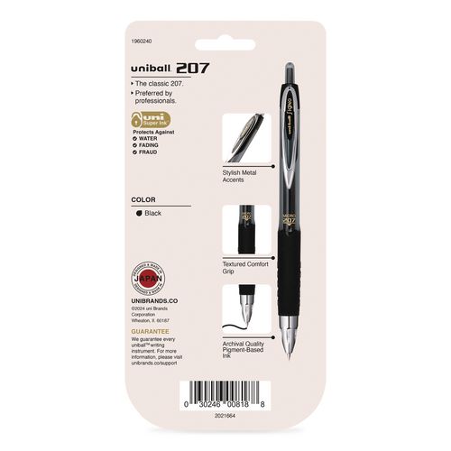 Product Details** Global Product Type Gel Pens Pen Style Retractable Pen Tip Type Conical Pen Point Size Type Fine Color Family Black Erasable Ink No Refillable Yes Pen Sub-Brand & Product Family Signo 207 Pen Type Gel Pen Pen Point Size 0.5 mm Pen Ink Color(s) Black Pen Barrel Color(s) Smoke/Black Low-Viscosity Ink No Special Ink Properties uni Super Ink™ Pen Grip Type Textured Visible Ink Supply Yes Pocket Clip Indicator Yes Product Biodegradability Indicator N Product Biodegradability in Days 0 Product Compostability Indicator N Pre-Consumer Recycled Content Percent 0% Post-Consumer Recycled Content Percent 0% Total Recycled Content Percent 0% Country Of Origin JP Carton Weight 8 lbs. Carton Pack Quantity 48 PK Pack Quantity 5 EA UPC 030246008188 UNSPSC 60121524 Shipping Weight & Item Dimensions Weight 0.14 lbs. Length 7.608 in Height 0.512 in Width 3.892 in