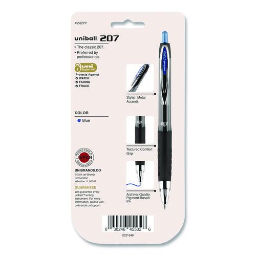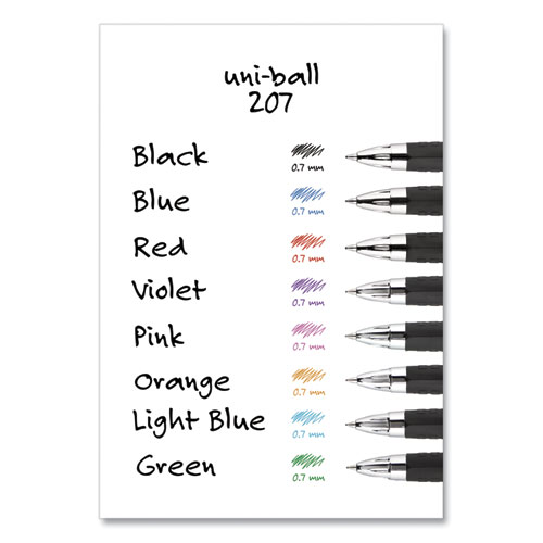Stock your office, home or classroom with 207 Retractable Gel Pens from uni-ball with a stainless steel tip that resists bending and breaking. Even-flowing, pigment-based gel ink delivers a smooth writing experience for intense, vibrant lines, ensuring that every mark is brilliantly communicated. Use these retractable gel pens for everyday writing tasks, check signing and all of your important signatures, trusting its quick-drying uni Super Ink. Innovative uni Super Ink technology effectively entraps the gel ink into the paper, producing fraud, fade and water-resistant documents that resist check washing or bleaching. A textured grip offers greater comfort and control as you continue writing, while a translucent ink window indicates the level of gel ink remaining, so you don’t run out unexpectedly. The sleek design of the 207 with modern metal accents gives the retractable gel pen a stylish touch.