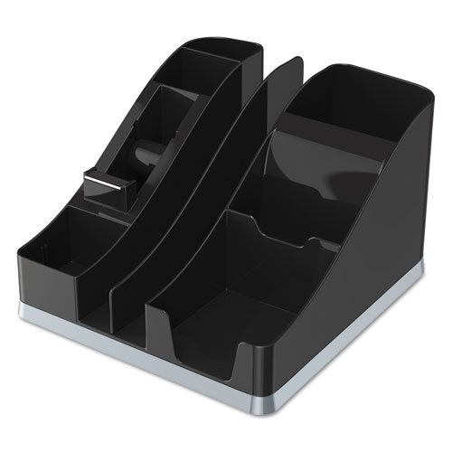 Makes the most of desktop space by combining accessories into a single unit. Keep everything neat, tidy, and within easy reach. Features six compartments for supplies, two slots for file folders and a built-in tape dispenser (tape not included) and accommodates 3″ x 3″ note paper. There’s even a spot for a cell phone or an MP3 player with space for the charging cord to run under the caddy.