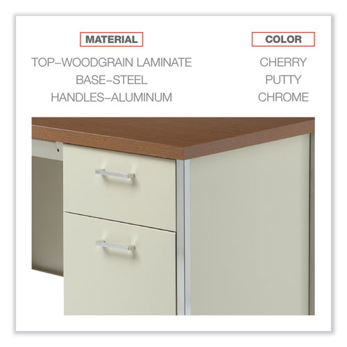 Product Details** Global Product Type Pedestal Office Desks Worksurface Shape Rectangular Color Family Cherry Pedestal Count 1 Keyboard/Mouse Platform Indicator No CPU Holder/Platform Indicator No Number of Drawers 3 Worksurface/Base Color Cherry/Putty Worksurface Material Woodgrain Laminate Edge Detail Profile Square Base Material Steel Overall Width (Max) 45.25″ Overall Depth (Max) 24″ Overall Height (Max) 29.5″ Pedestal Types 3/4-Height Drawer Type Right: Box/File,Center: Box Number of Shelves 0 Product Biodegradability in Days 0 Compliance Standards Meets or Exceeds ANSI/BIFMA Standards Pre-Consumer Recycled Content Percent 31% Post-Consumer Recycled Content Percent 17% Total Recycled Content Percent 48% Special Features Chrome-Plated Legs Country Of Origin US Carton Weight 108 lbs. Carton Pack Quantity 1 EA Pack Quantity 0 UPC 042167400156 UNSPSC 56101703 Shipping Weight & Item Dimensions Weight 108 lbs. Length 48 in Height 22.25 in Width 26.5 in Warranty Manufacturer’s limited five-year warranty.