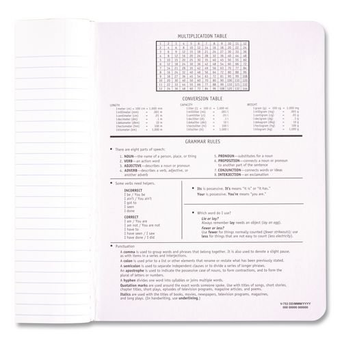 Product Details** Global Product Type Composition Books Pocket Sized No Book-Binding Type Sewn Color Family Black Number of Subjects/Sections 3 Sheet Size (Bound-Side First) 9.75 x 7.5 Sheet Rule/Format Type Wide/Legal Rule Book-Binding Edge Side Cover Color Black Book-Spine Length 9.75″ Book Width 7.5″ Front-Cover Material Cardboard Back-Cover Material 33-pt Chipboard Number of Section Dividers 2 Sheets per Book/Journal 100 Sheet Color White Sheet Ruling Size 11/32″ Note-Rule Lines per Sheet 24 Sheet-Ruling Color Blue Sheet Basis Weight (lb) 15 lb Bond Dated No Product Biodegradability Indicator N Product Biodegradability in Days 0 Product Compostability Indicator N Pre-Consumer Recycled Content Percent 0% Post-Consumer Recycled Content Percent 0% Total Recycled Content Percent 0% Country Of Origin VN Carton Weight 10 lbs. Carton Pack Quantity 1 PK Pack Quantity 12 EA UPC 043100729365 UNSPSC 14111514 Shipping Weight & Item Dimensions Weight 9.6 lbs. Length 0.438 in Height 9.75 in Width 7.5 in
