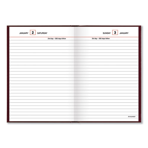 Product Details** Global Product Type Daily Diaries Pocket Sized Yes Book-Binding Type Sewn Color Family Red Number of Subjects/Sections 1 Sheet Size (Bound-Side First) 7.5 x 5 Sheet Rule/Format Type Medium/College Rule Book-Binding Details Casebound: Hard Cover Book-Binding Edge Side Cover Color Red Book-Spine Length 7.88″ Book Width 5.38″ Front-Cover Material Moire Vinyl Back-Cover Material Moire Vinyl Sheets per Book/Journal 201 Sheet Color White Sheet Rule/Format Details One Day per Page,Month/Date Sheet Ruling Size 9/32″ Note-Rule Lines per Sheet 27 Sheet-Ruling Color Blue Dated Yes Edition Year 2026 Product Biodegradability Indicator N Product Biodegradability in Days 0 Product Compostability Indicator N Pre-Consumer Recycled Content Percent 0% Post-Consumer Recycled Content Percent 0% Total Recycled Content Percent 0% Country Of Origin CN Carton Weight 27 lbs. Carton Pack Quantity 24 EA Pack Quantity 0 UPC 038576391826 UNSPSC 44112006 Shipping Weight & Item Dimensions Weight 1.11 lbs. Length 7.938 in Height 1.125 in Width 5.625 in