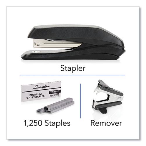 Product Details** Global Product Type Full-Size Desktop Staplers High Capacity Stapling No Flat Clinch Plate No Power Source(s) Manual Tacking Yes Color Family Black Staple Capacity Full Strip (210 Staples) Type of Staple Used Standard Sheet Capacity 15 Replacement Staples Swingline® 35108, 35450, 35481, 35556 Leg Size 0.25″ Crown Size 0.5″ Color(s) Black Material(s) Plastic,Metal Product Biodegradability in Days 0 Package Includes (1) Deluxe Staple Remover,(1) Pack of 1,250 S.F.® 4® Premium Staples Pre-Consumer Recycled Content Percent 0% Post-Consumer Recycled Content Percent 0% Total Recycled Content Percent 0% Footnote 1 Antimicrobial product protection safely reduces the growth of bacteria, viruses and mold Footnote 2 All sheet capacities are based on 20-lb. bond Country Of Origin CN Carton Weight 9 lbs. Carton Pack Quantity 12 EA Pack Quantity 0 UPC 074711545679 UNSPSC 44121615 Shipping Weight & Item Dimensions Weight 0.595 lbs. Length 9.085 in Height 1.995 in Width 6.35 in Warranty Manufacturer’s limited one-year warranty.