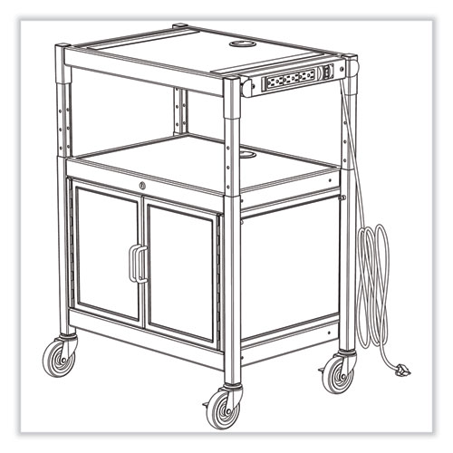 Upgrade your presentation setup with the Steel Adjustable AV Cart with Cabinet, a durable and versatile solution for classrooms, offices and conference rooms. Designed to hold monitors up to 20 inches, this sturdy steel cart offers a height-adjustable design, allowing you to customize the height from 26 to 42 inches in 2-inch increments to meet your viewing and accessibility needs. Equipped with a secure locking cabinet, it provides safe storage for valuable AV equipment, accessories or presentation materials. The built-in six-outlet, UL-approved mini-surge protector ensures convenient power access while protecting your electronics from surges. For effortless mobility, the cart moves smoothly on four durable casters, with two locking wheels to keep it securely in place when needed. Whether used for projectors, laptops, or media devices, this reliable and mobile AV cart delivers functionality, security and convenience, making it a must-have for any professional or educational setting. Enhance your presentations with this all-in-one AV solution today!