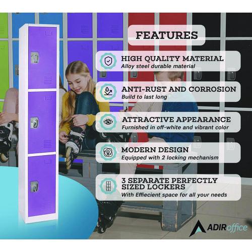 Product Details** Global Product Type Three-Tier Lockers Color(s) Purple Number of Shelves 2 Shelf Capacity (Weight) 50 lbs Drawer Configuration 0 Material(s) Steel Overall Width 12″ Overall Depth 12″ Overall Height 72″ Maximum Weight Capacity 100 lbs Tray Quantity 0 Number of Compartments 3 Door Quantity 3 Number of Drawers 0 Caster/Glide/Wheel No Series Name AdirOffice 629 Series Product Biodegradability Indicator N Product Biodegradability in Days 0 Product Compostability Indicator N Pre-Consumer Recycled Content Percent 0% Post-Consumer Recycled Content Percent 0% Total Recycled Content Percent 0% Country Of Origin CN Carton Weight 45 lbs. Carton Pack Quantity 1 EA Pack Quantity 0 UPC 840309408325 UNSPSC 56101520 Shipping Weight & Item Dimensions Weight 45 lbs. Length 73 in Height 4 in Width 14 in Warranty Manufacturer’s one-year warranty.