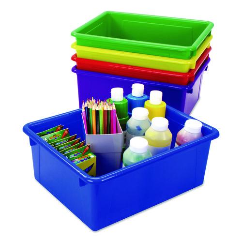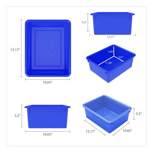 Product Details** Global Product Type Open Boxes & Bins Number of Compartments 1 Maximum Volume Range 1 to 5 gal Material Family Plastic Color Family Multicolor Stackable Yes Capacity (Volume) 2.81 gal Capacity (Weight) 8 lb Material(s) Plastic Width 10.65″ Depth 13.17″ Height 5.2″ Color(s) Assorted Bright Color Assortment Blue,Green,Purple,Red,Yellow Lid Sold Separately Yes Maximum Stacking Height 5 Product Biodegradability Indicator N Product Biodegradability in Days 0 Product Compostability Indicator N Pre-Consumer Recycled Content Percent 0% Post-Consumer Recycled Content Percent 0% Total Recycled Content Percent 0% Special Features Deep Tray in Bright Colors—Perfect for STEAM or STEM color coding. Country Of Origin CA Carton Weight 4 lbs. Carton Pack Quantity 1 PK Pack Quantity 5 EA UPC 685442625303 UNSPSC 24112003 Shipping Weight & Item Dimensions Weight 4.2 lbs. Length 13.4 in Height 11 in Width 10.9 in Warranty Manufacturer’s limited 90-day warranty.