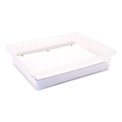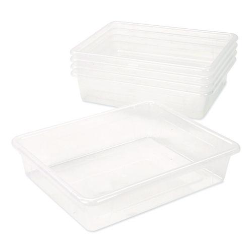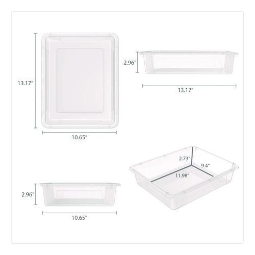 Product Details** Global Product Type Open Boxes & Bins Number of Compartments 1 Maximum Volume Range 1 to 5 gal Material Family Plastic Color Family Clear Stackable Yes Capacity (Volume) 1.69 gal Capacity (Weight) 5 lb Material(s) Plastic Width 10.65″ Depth 13.17″ Height 2.96″ Color(s) Translucent Lid Sold Separately Yes Maximum Stacking Height 10 Product Biodegradability Indicator N Product Biodegradability in Days 0 Product Compostability Indicator N Pre-Consumer Recycled Content Percent 0% Post-Consumer Recycled Content Percent 0% Total Recycled Content Percent 0% Special Features Flat Tray Country Of Origin CA Carton Weight 4 lbs. Carton Pack Quantity 1 PK Pack Quantity 5 EA UPC 685442625655 UNSPSC 24112003 Shipping Weight & Item Dimensions Weight 4.2 lbs. Length 13.4 in Height 11 in Width 10.9 in Warranty Manufacturer’s limited 90-day warranty.