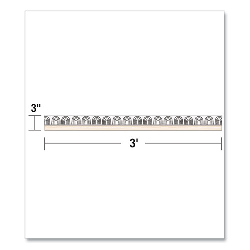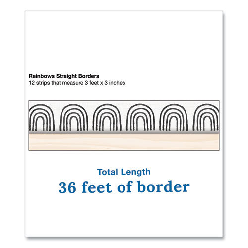 Product Details** Global Product Type Classroom Board & Wall Decorations Theme Rainbows Color Family Multicolor Width 3″ Length 3 ft Color(s) Black/White/Cream Product Biodegradability Indicator N Product Biodegradability in Days 0 Product Compostability Indicator N Pre-Consumer Recycled Content Percent 0% Post-Consumer Recycled Content Percent 0% Total Recycled Content Percent 0% Country Of Origin US Carton Weight 48 lbs. Carton Pack Quantity 144 PK Pack Quantity 12 EA UPC 044222304720 UNSPSC 60111200 Shipping Weight & Item Dimensions Weight 0.28 lbs. Length 0.15 in Height 38.14 in Width 3.3 in