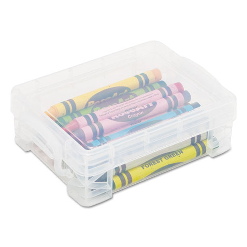 Durable crayon box is the perfect school-time companion. Stackable design helps conserve space in busy classrooms. Snap-tight lid and handles keep contents secure. Case holds 24 count crayon box or playing cards. Clear case allows for easy recognition of contents–no need to dig for your favorite color.